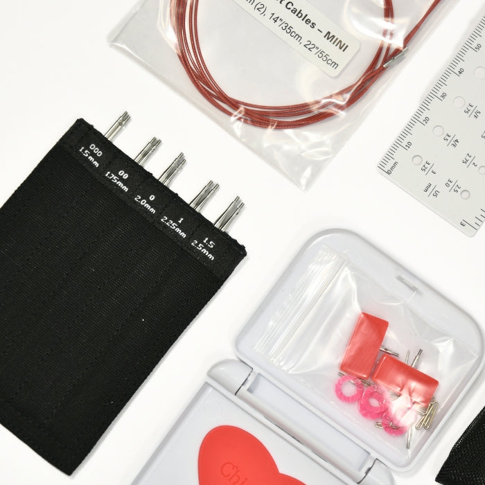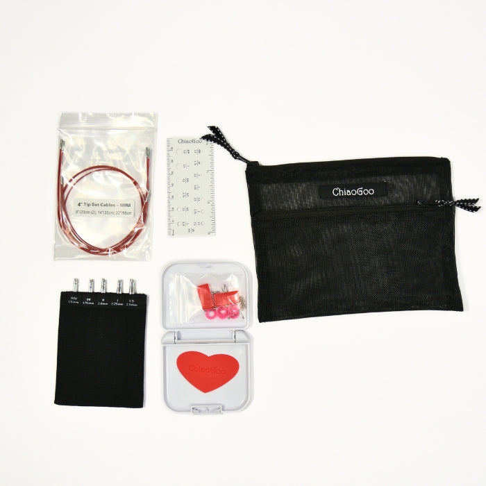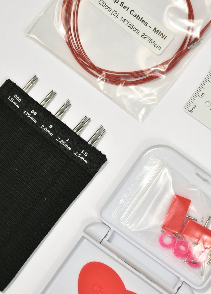 This ChiaoGoo TWIST Red Lace Interchangeable Set includes five solid stainless-steel lace tips from 1.5–2.5 mm, three memory-free MINI red cables and all the small tools needed for secure connections. The cables create 40, 56 and 76 cm circulars, and each tip features two tightening holes for an extra-secure join. Packed in a compact black mesh pouch with a separate tip sleeve, the MINI system is designed for fine-gauge knitting. MINI cables are not compatible with S or L tips without adapters.