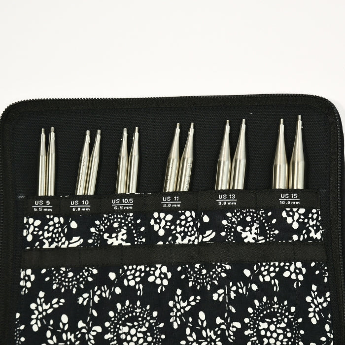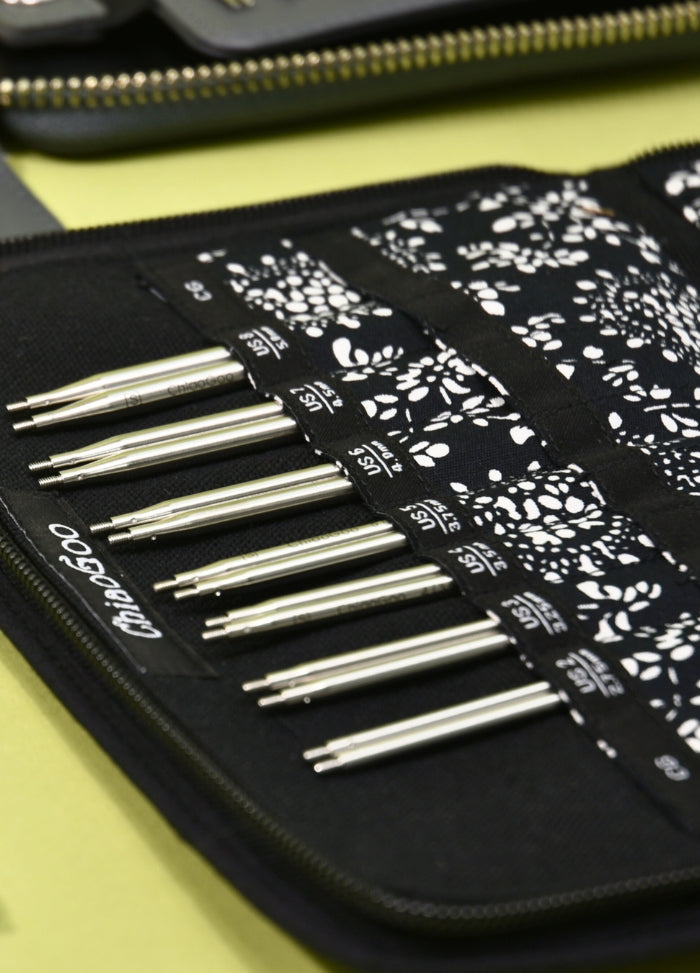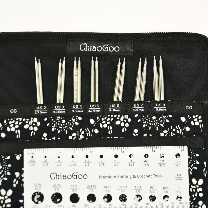 This ChiaoGoo TWIST Red Lace Interchangeable Set contains the full range of stainless-steel lace tips across the Small and Large systems, covering 2.75–10 mm. Memory-free red cables (35, 55, 75 cm) make circulars of 60, 80 and 100 cm. The set includes coded stoppers, keys, connectors, markers, a gauge and a durable zippered case. A complete solution for knitters wanting the full 13 cm interchangeable range.