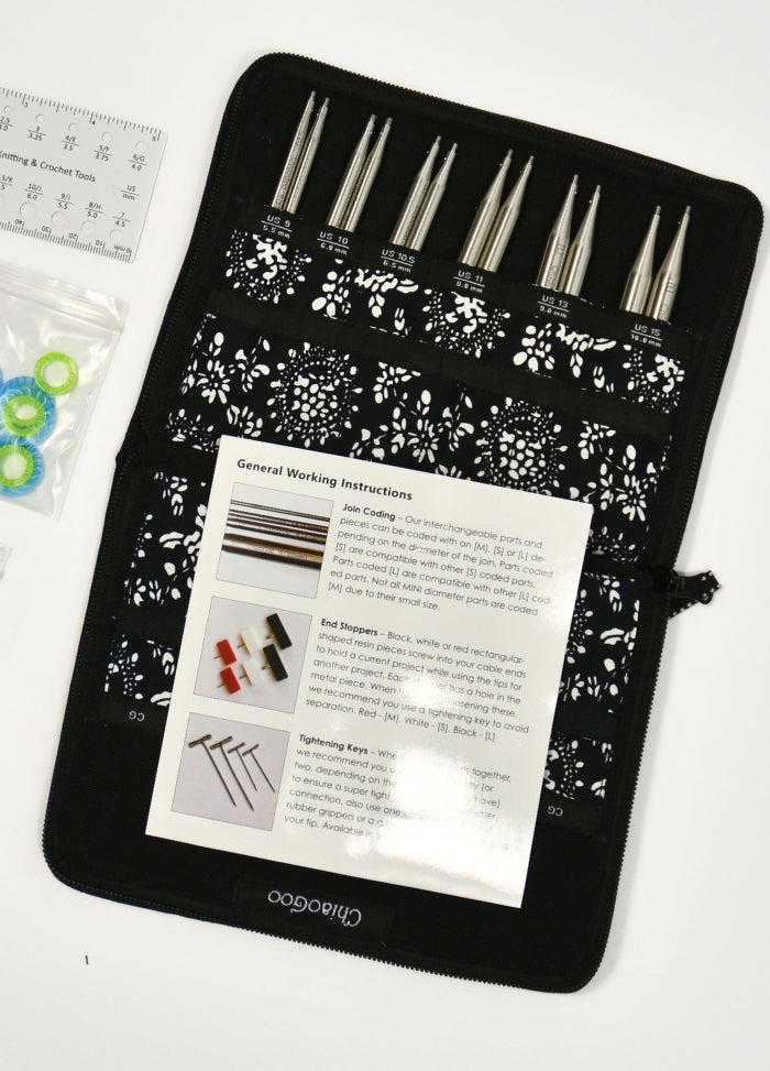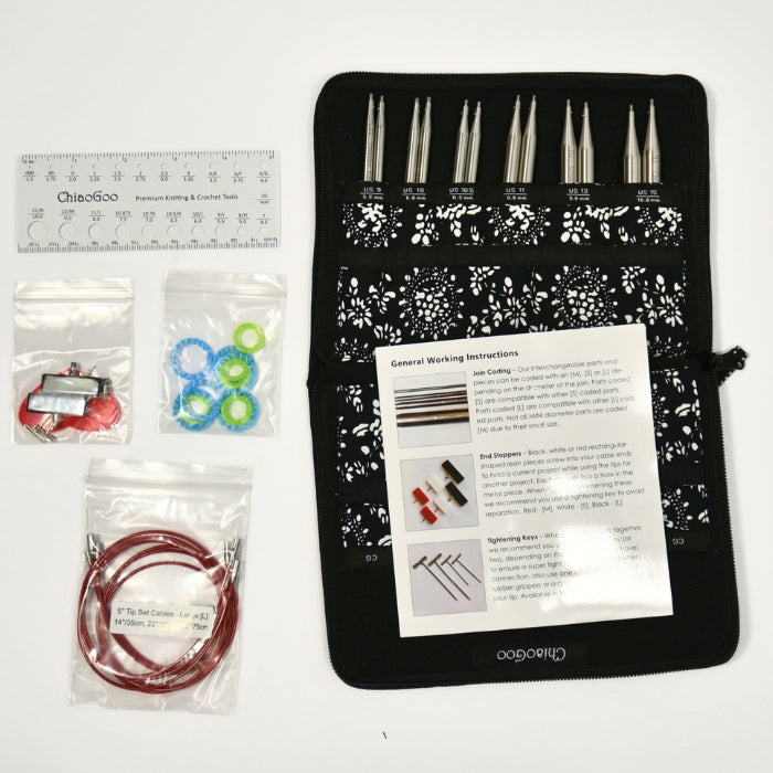 The ChiaoGoo TWIST Red Lace Interchangeable Set includes stainless-steel lace tips in larger sizes from 5.5–10 mm. Paired with red, memory-free cables, the set creates 60, 80 and 100 cm circulars, suitable for garments, blankets and heavier yarns. The set includes stoppers, connectors, keys, stitch markers, a gauge and a sturdy zip case.