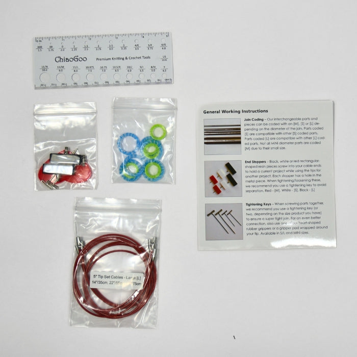 Extras - 2 × Large End Stoppers, 1 × Large Cable Connector, 2 × T-shaped tightening keys, needle gauge, stitch markers & gripper