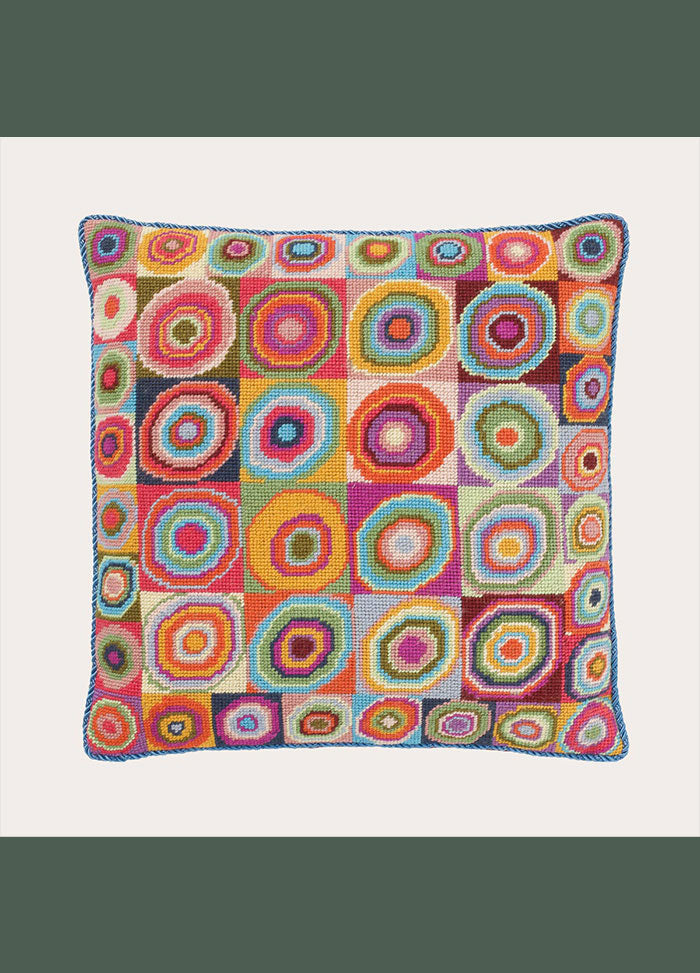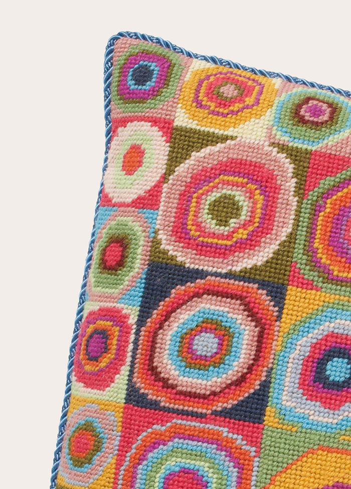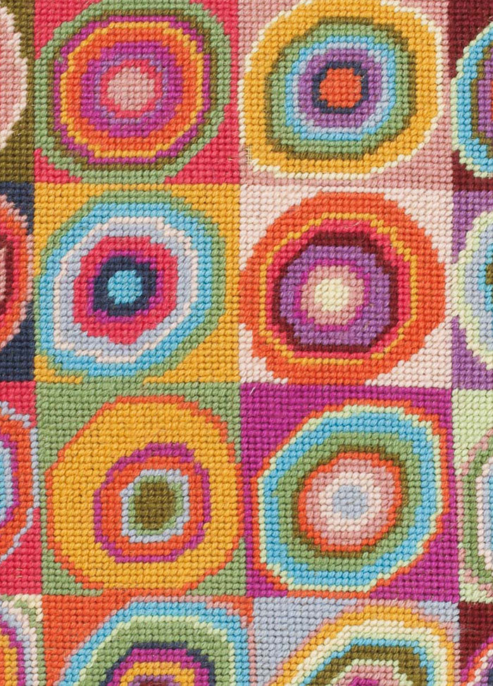 Inspired by the vibrant concentric circles of Wassily Kandinsky's abstract art, Kaffe Fassett's Zoom transforms this iconic pattern into a dynamic tapestry. The design features a grid of colourful concentric circles in bold hues, creating a lively and modern aesthetic. The 10-count canvas and pure new wool threads ensure a satisfying stitching experience, resulting in a striking cushion front that adds a pop of colour to any room.