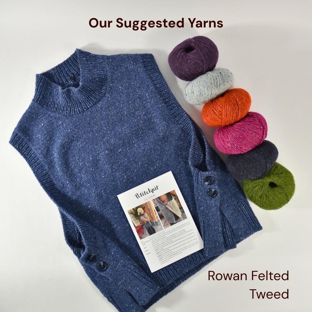 Whether you're a confident beginner or an intermediate knitter looking for a stylish weekend project, the Lulu Slipover offers a fun, structured knit with wearable rewards. Let’s button up and get crafting together!