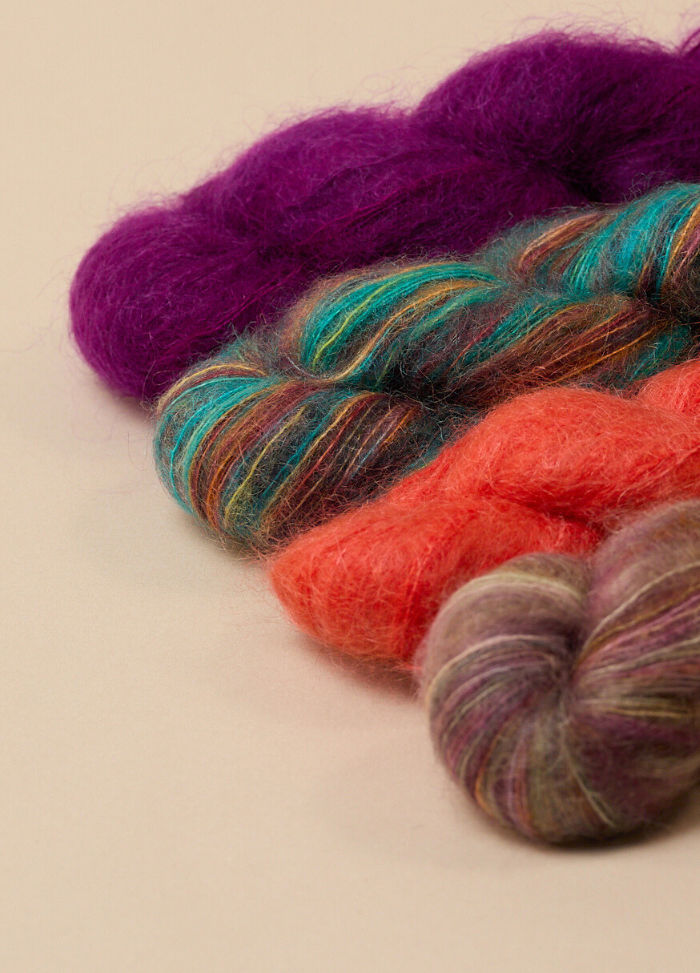 Cabrito is perfect for shawls, wraps, and delicate accessories when knit alone, or for pairing with other yarns to add halo, softness, and depth. It works beautifully in lightweight sweaters and layering garments.