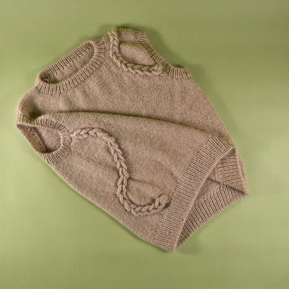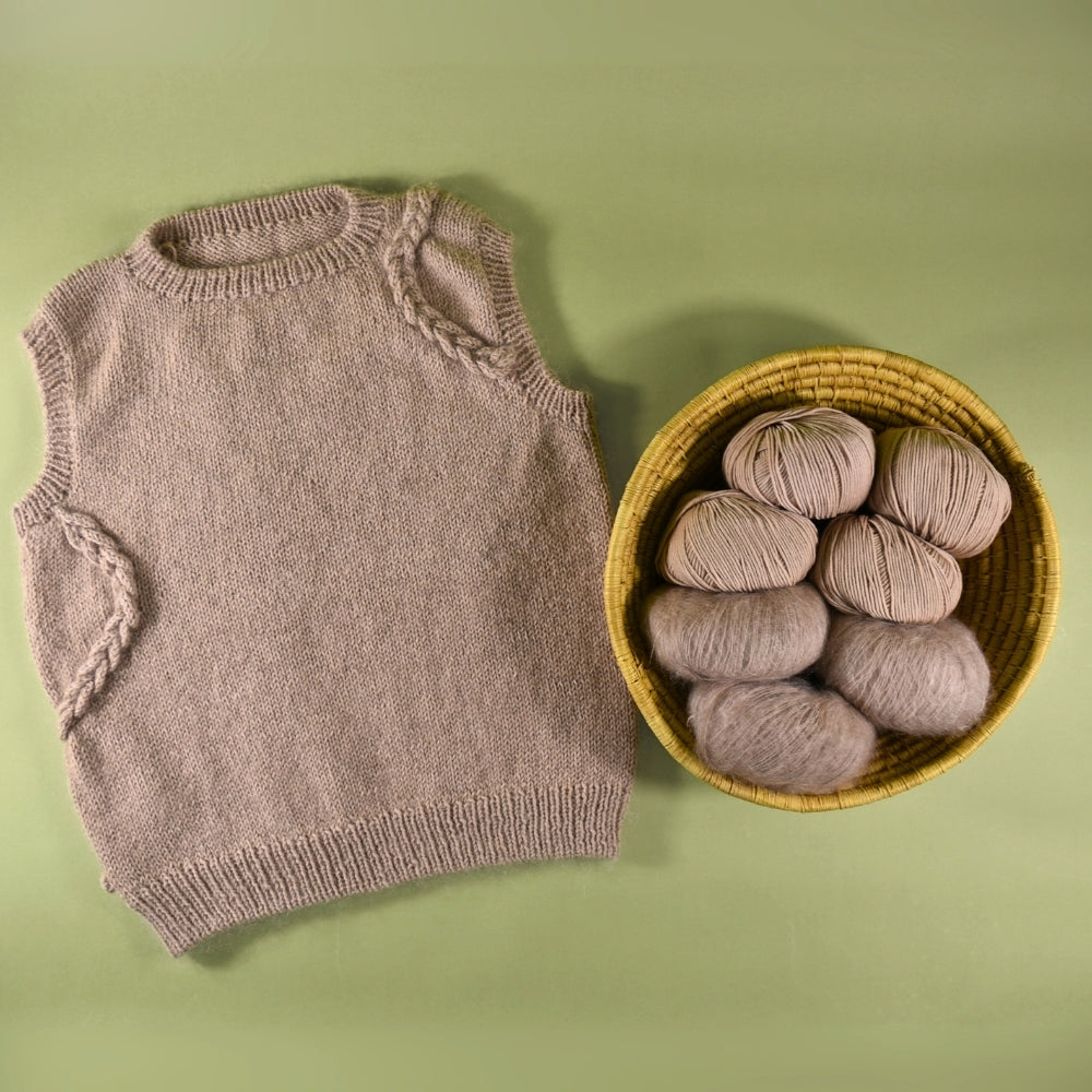 The cables are shaped using short rows without wraps, creating soft, graceful curves through the fabric. The vest is then joined and worked in the round down to the hem for a smooth finish.