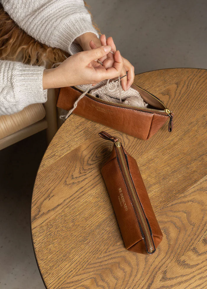 Re:Designed Project 12 is a compact leather project bag designed for small knitting or crochet projects. It features a zip closure to keep your items secure and is made from milled cow leather that retains its natural grain after dyeing. The bag is finished with a smooth, soft waxed surface, providing a durable and stylish storage solution.
