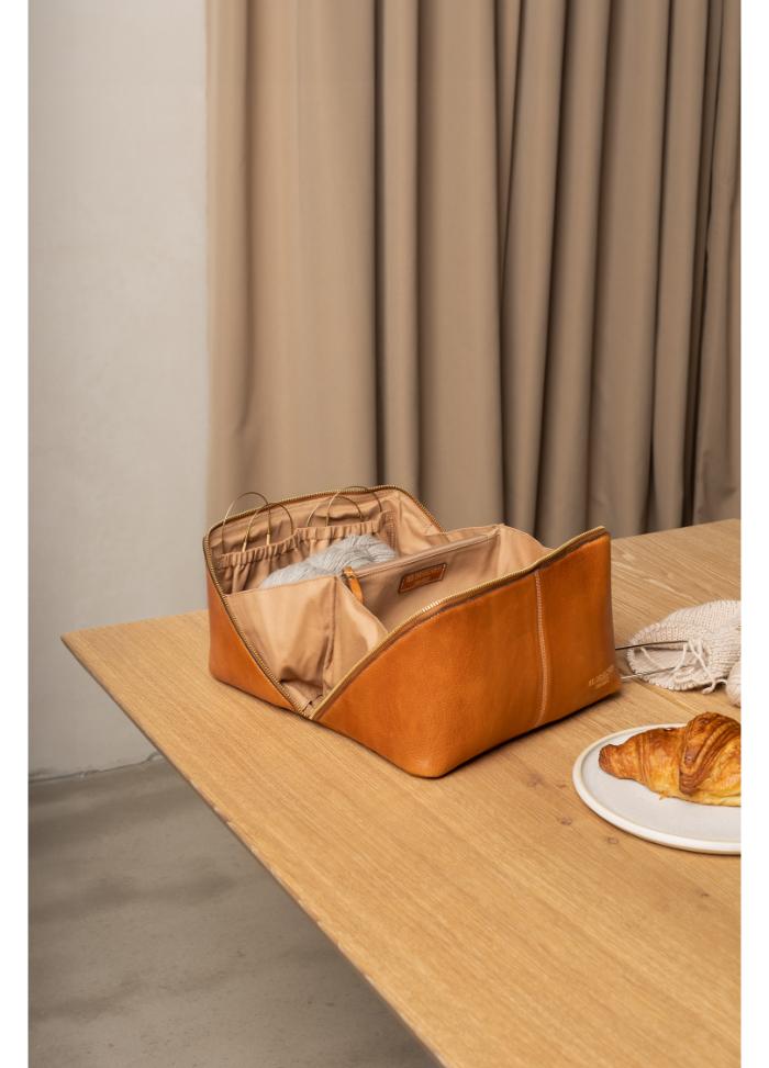 Designed for makers on the move, it features a structured shape and top handle for easy carrying, protecting your project wherever you go. Handcrafted from soft, natural-grain leather with a light wax finish, it develops a rich patina over time — looking better with every season. Finished with a smooth zip closure and colour-matched details to keep everything secure and beautifully tidy.