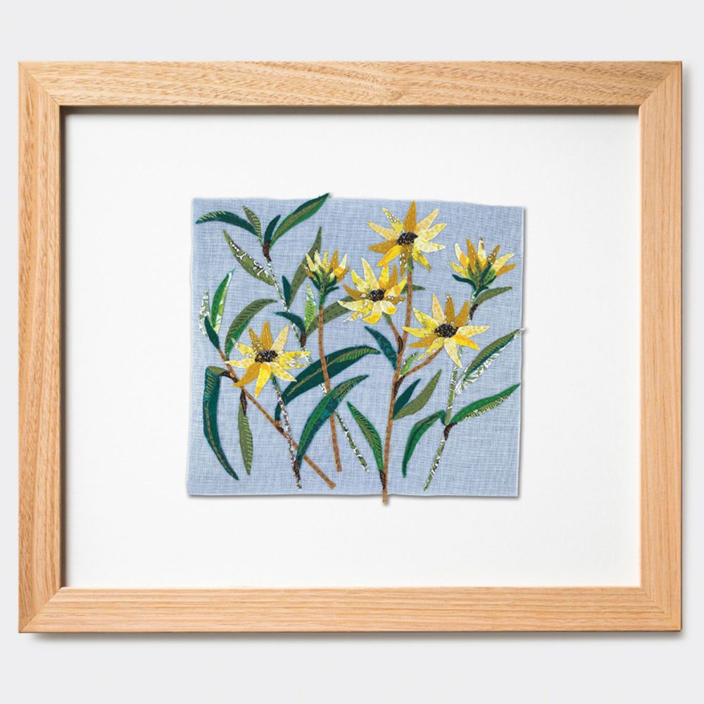 The Swamp Daisy kit brings calm energy with gently understated petals and foliage in soft colours. Featuring Liberty prints alongside antique fabrics and thread, it’s ideal for a relaxed, tactile stitching experience. Approx finished size: 22.9 × 20.3 cm (9″ × 8″).